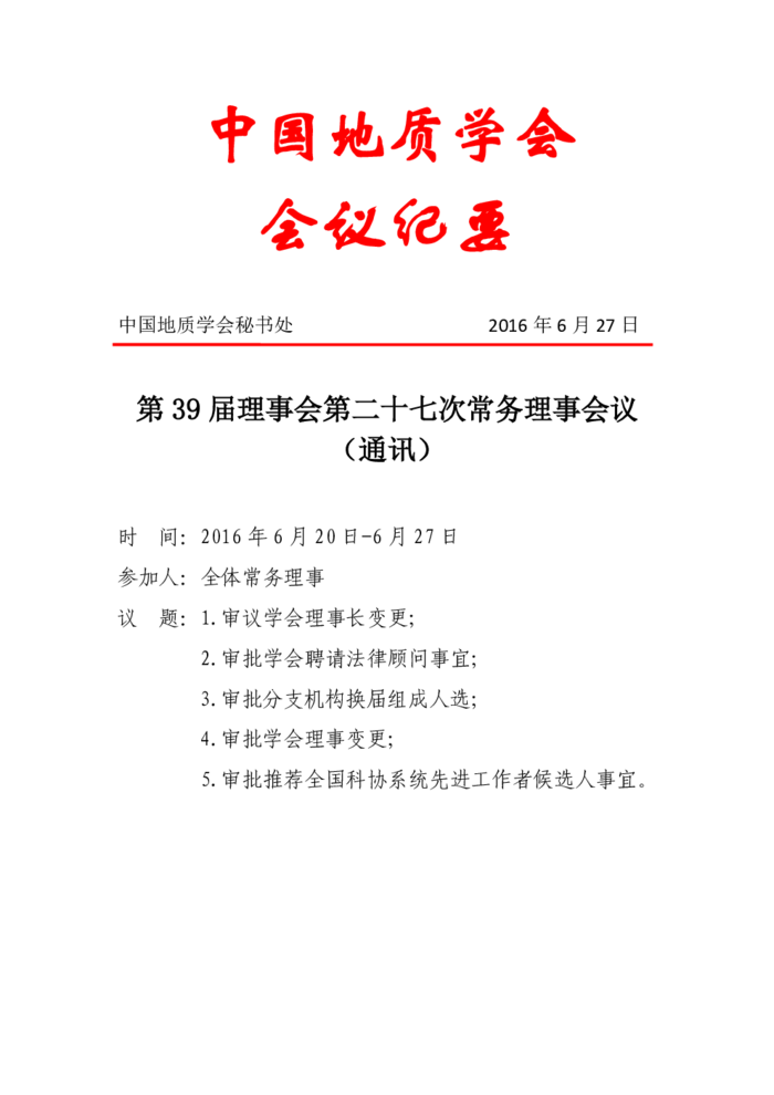 ? 中国地质学会召开第39届理事会第二十七次常务理事(通讯)会议 2016-06-28